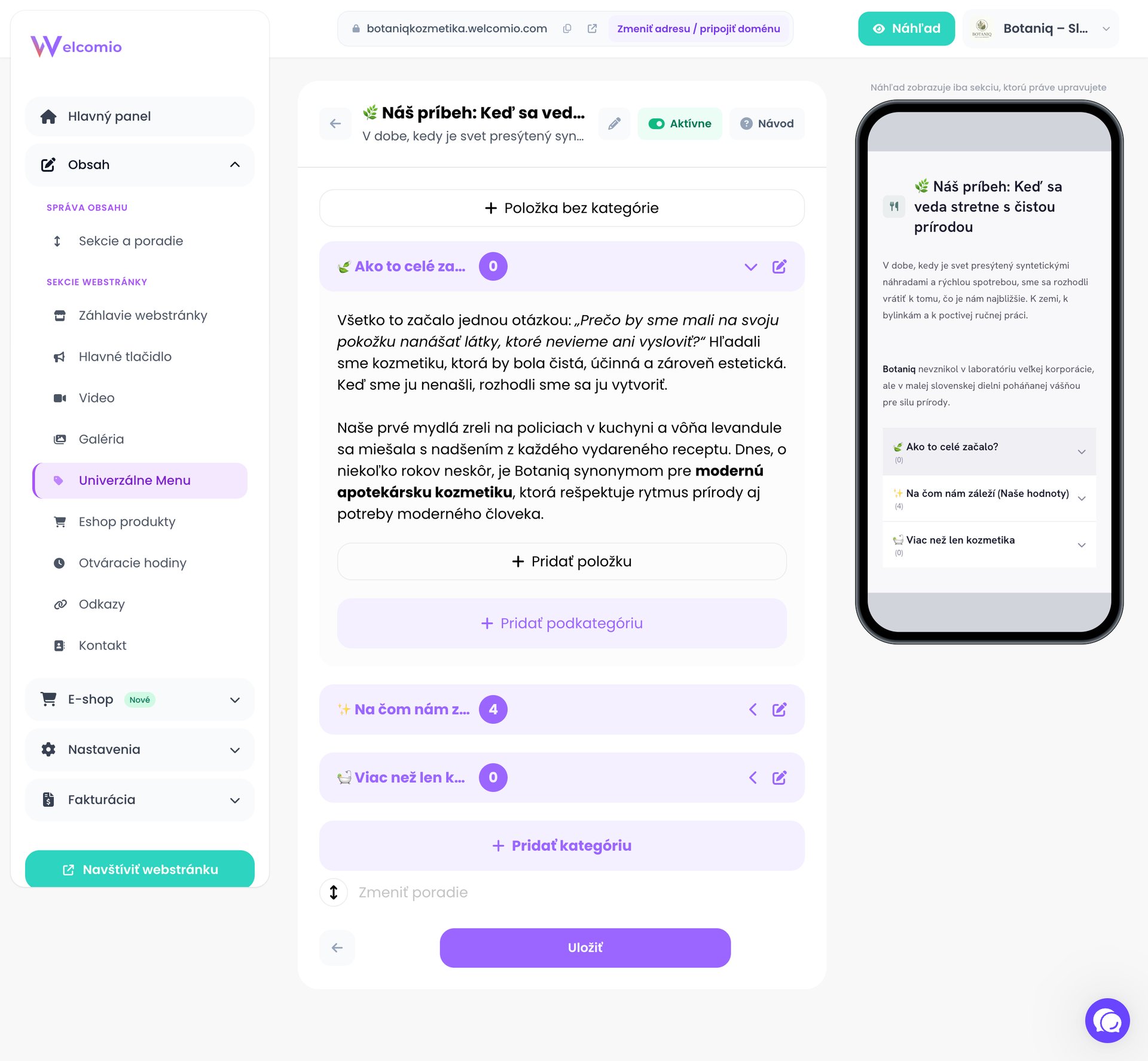 Welcomio ma naozaj super easy rozhranie, jednoduché, intuitívne a zvládnuteľné pre každého. Na jednoduché stránky pre malé alebo začínajúce podniky nie je asi nič jednoduchšie a zároveň tak efektívne. Web vyzerá minimalisticky, čisto, moderne a dobre sa zobrazuje na mobile aj počítači. - Mishell Ka